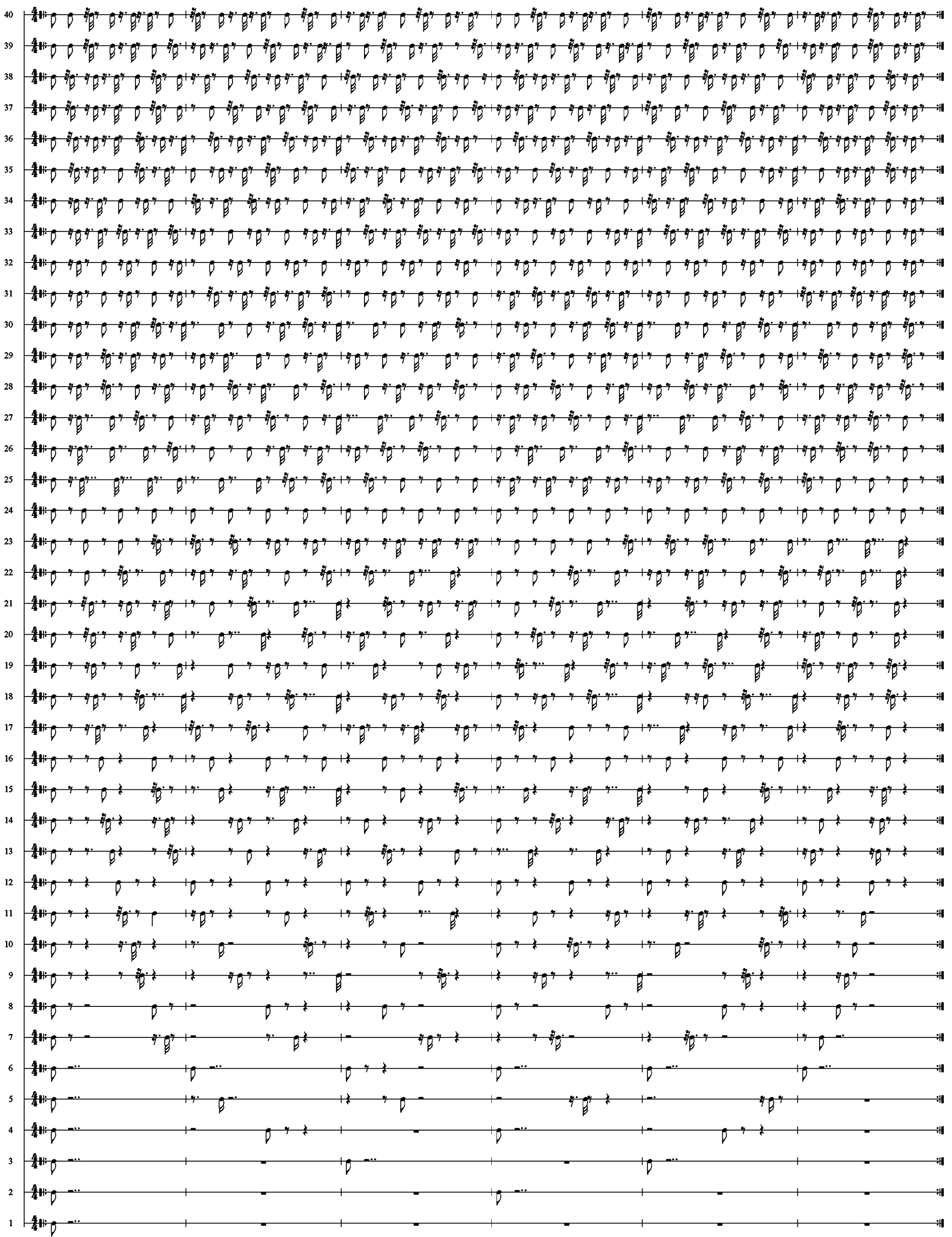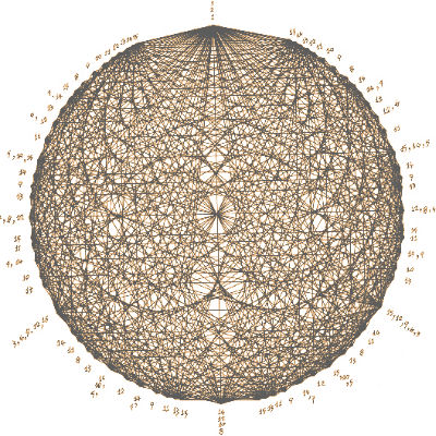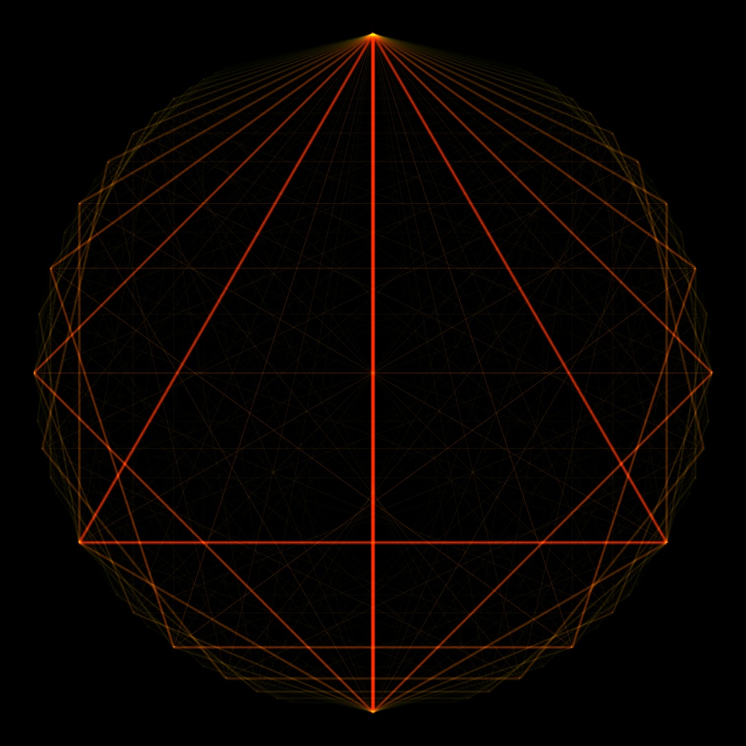 “Harmonia” is an impression upon a two-dimensional (symmetrical) Space and on one-dimensional (but bi-directional) Time. Both dimensions are informed by the same logarithmic relationships as those of the Pythagorean harmonic intervals. The best way to describe “Harmonia” is for you to imagine a vibrating string producing 64 overtones. The string is bent around to form a circle with the two ends of the string meeting at the top of the circle. The nodes of each overtone are connected to each other by diagonal lines. In the higher overtones these polygons and their diagonals cause phasing patterns at each of their respective appearances. In parallel to this “closed” string, imagine a string whose ends are two points in time. (In the case of “Harmonia”, these two points in time also determine the duration of the entire cycle of “Harmonia”.) Indebted to the harmonic philosophy of Pythagoras and Plotinus, the original drawings of “Harmonia” represent a classic case of “automatic writing” or psychography. The first of the series, much more complex than the one shown above, emerged spontaneously during a night in the fall of 1980 with only the help of rapidographs, a ruler, a compass, and a few sheets of architect’s velum (transparent) paper. Its completion required several days (and nights) of incessant drawing with no consciousness of process or end-purpose present. Although quite simple to detect now, it was a few days later that I realized that I was graphically representing in these Mandalas the same rhythmic matrix below that I had already used in other compositions during the preceding year. In the year 2008, composer, sound designer and computer programmer Bruno Degazio created the animation of “Harmonia” and since then “Harmonia” has been presented internationally as an audiovisual installation. —Christos Hatzis