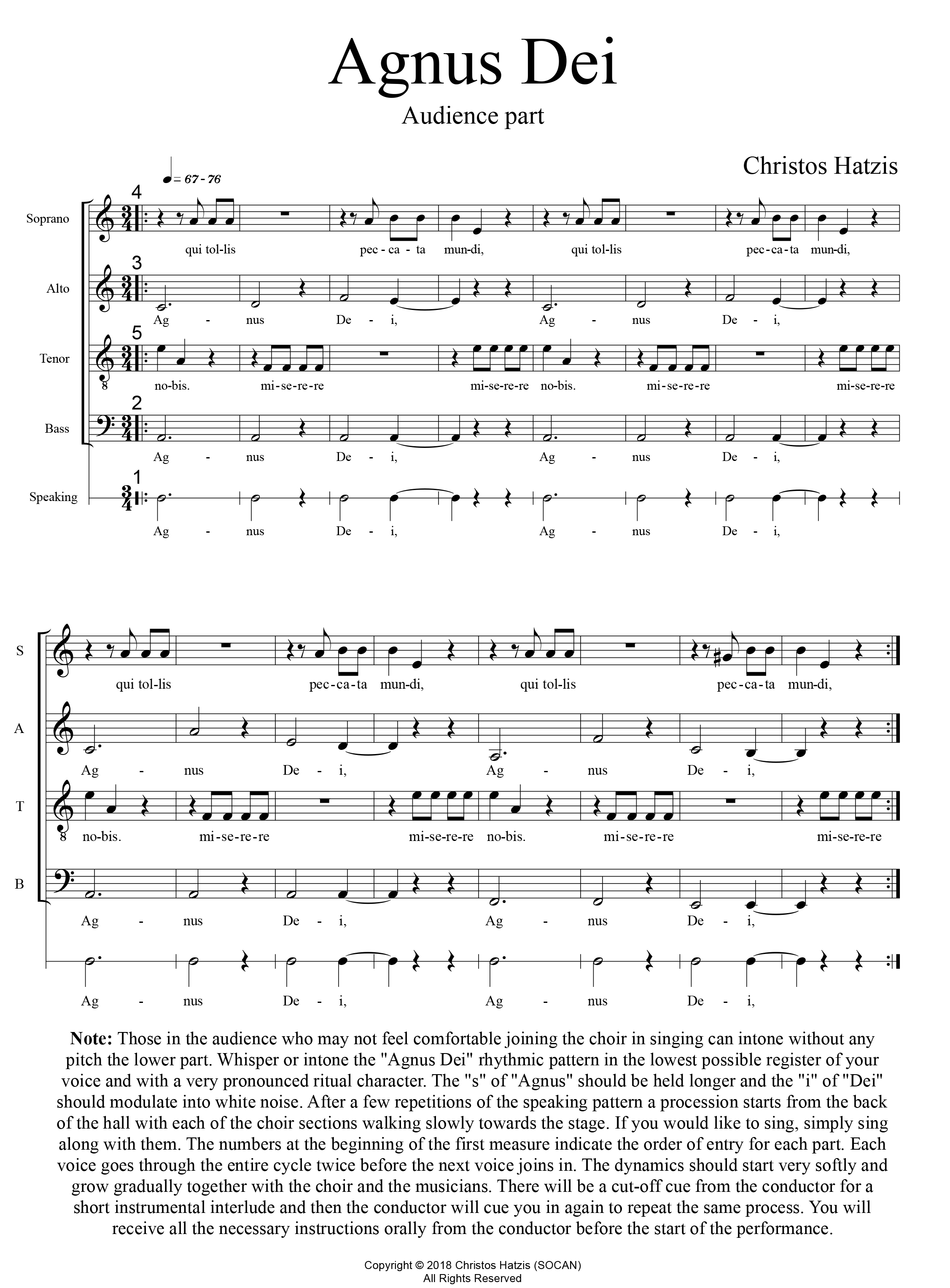 The most recent version for bass clarinet, ambient soundscape and community choir(s) which was created during the summer of 2018 is the definitive one as far as I am concerned. In this latest incarnation, Agnus Dei has been transformed into a dark composition for our dark times with apocalyptic warnings but also encouragement for community-bonding through singing. The strictly repetitive, “New-Age” character of the vocal music and the audience’s involvement in the music’s unfolding, are more recognizable as elements of a ritual than a work of concert music. The music’s hypnotic ‘tuning’ effect on the audience and the various types or levels of participation that are available to the listeners (and some of the performers) suggest a spirituality that is not only inwardly but also communal—the kind of spirituality I am personally devoted to. In such a musical experience the personal and communal aspects far outweigh the compositional accomplishment of the individual creator and, like with any ritual or even folk music, this balance allows the participants to be and feel central to the activities about them, as opposed to being (and feeling) passive witnesses to a creative act external to them.